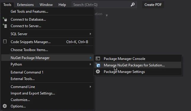 ! Le menu Outils de Visual Studio s'ouvre et affiche l'option Gestionnaire de packages NuGet sous le menu Outils Naviguez vers le Gestionnaire de Paquets NuGet