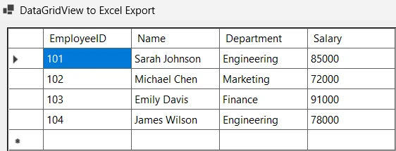 dt.Rows.Add(103, "Emily Davis", "Finance", 91000)