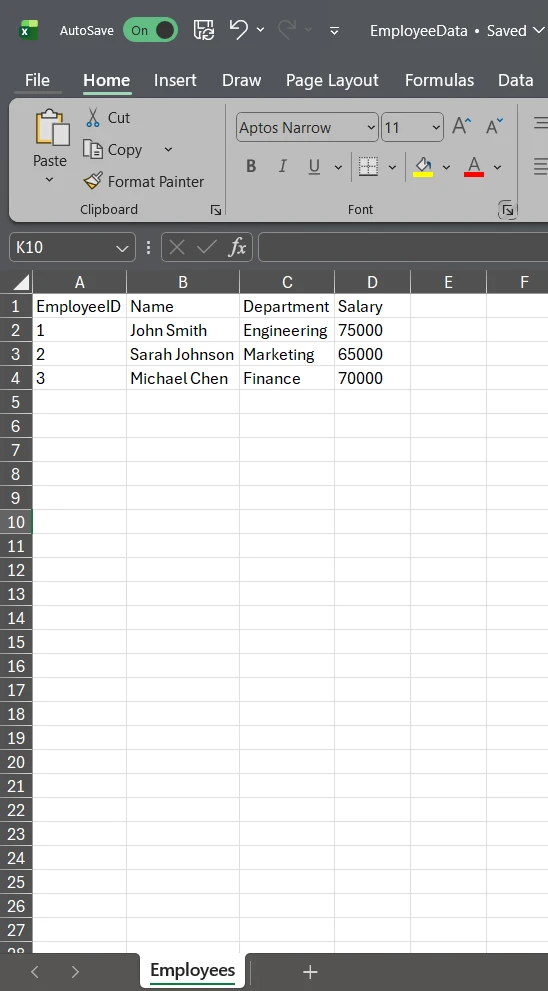dt.Rows.Add(2, "Sarah Johnson", "Marketing", 65000);