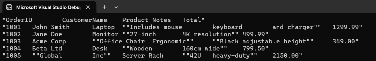 L'approche manuelle échoue lorsque les champs CSV contiennent des virgules intégrées dans des chaînes de caractères entre guillemets - un scénario courant dans les champs d'adresse ou les descriptions. Pour lire et écrire correctement des fichiers CSV, il faut gérer les champs entre guillemets, les guillemets échappés, les valeurs multilignes et les différents encodages. L'utilisation de la bibliothèque CsvHelper ou de packages CSV Helper similaires ajoute des dépendances, tandis que le déploiement de votre propre analyseur signifie la création d'un nouveau StreamReader, la mise en œuvre d'un modèle de lecteur var et la gestion de l'ensemble du processus de lecture du fichier par vous-même.