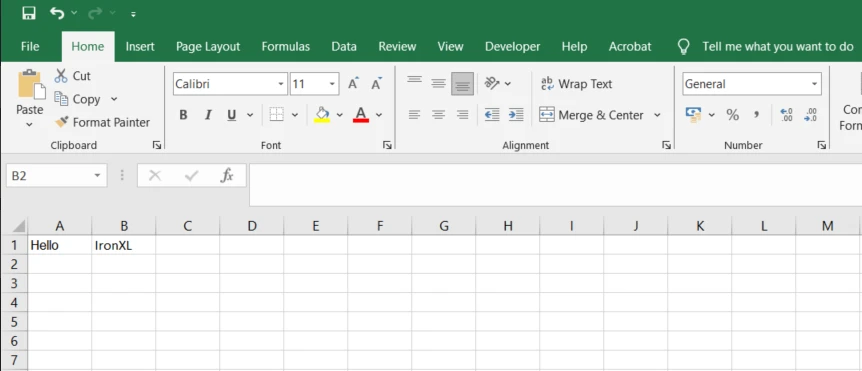 Cet extrait de code crée un nouveau classeur Excel, ajoute une feuille de calcul nommée " Sheet1 ", utilise IronXL pour écrire des données dans les cellules A1 et B1, et enregistre le classeur au format XLSX à l'emplacement de fichier spécifié. Assurez-vous que l'emplacement où vous prévoyez d'enregistrer le fichier Excel dispose des autorisations d'écriture nécessaires. Vous pouvez également utiliser un modèle de fichier Excel existant pour enregistrer les documents.