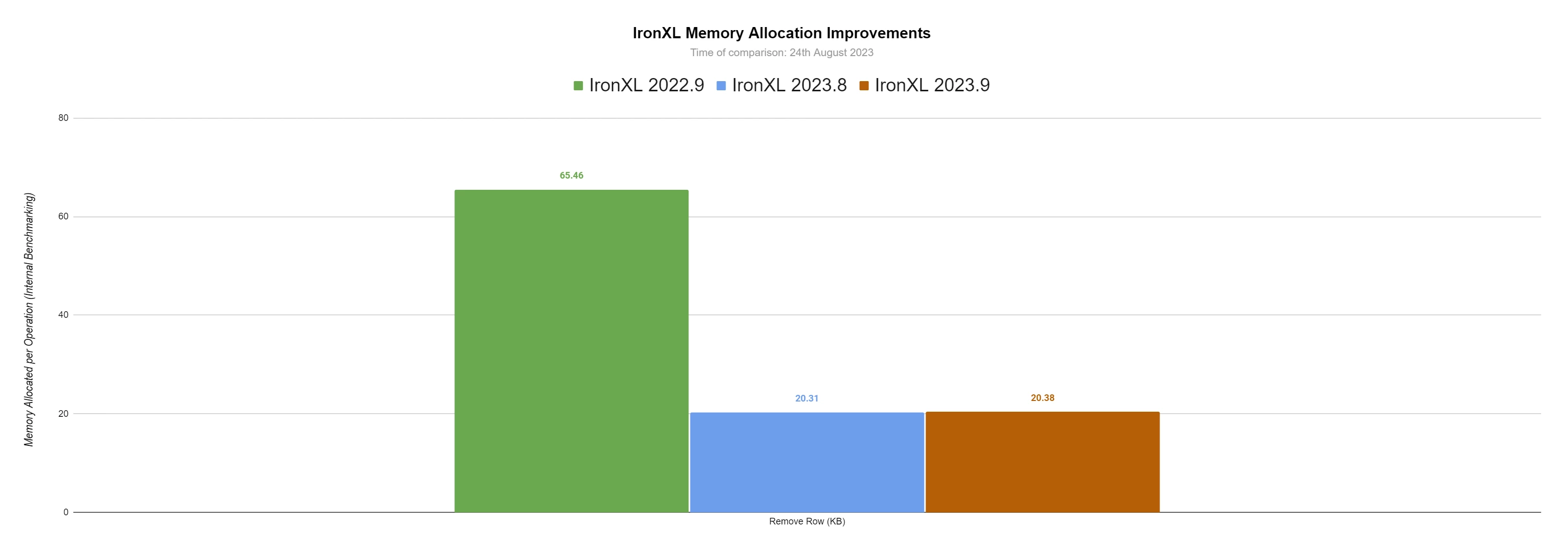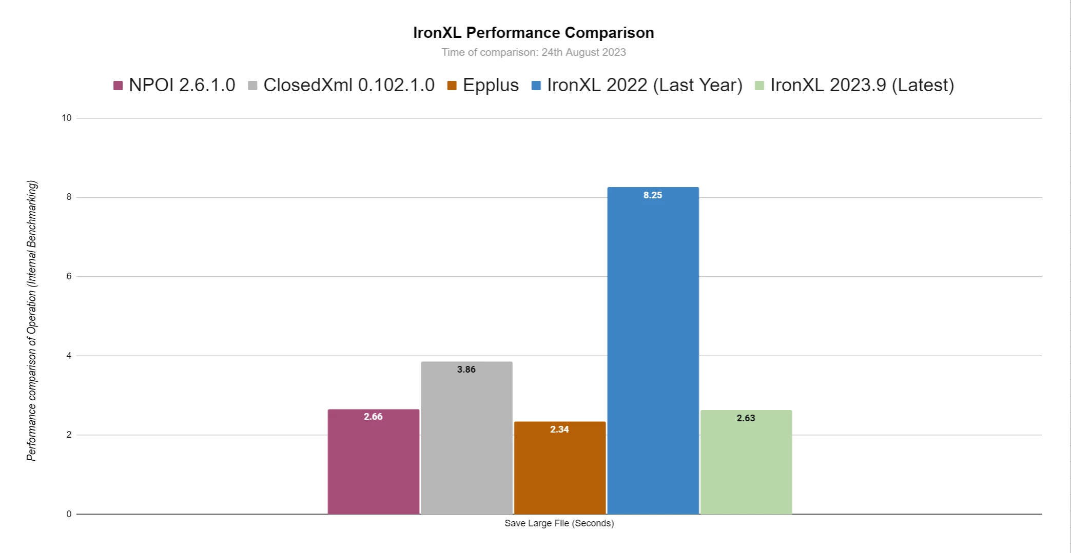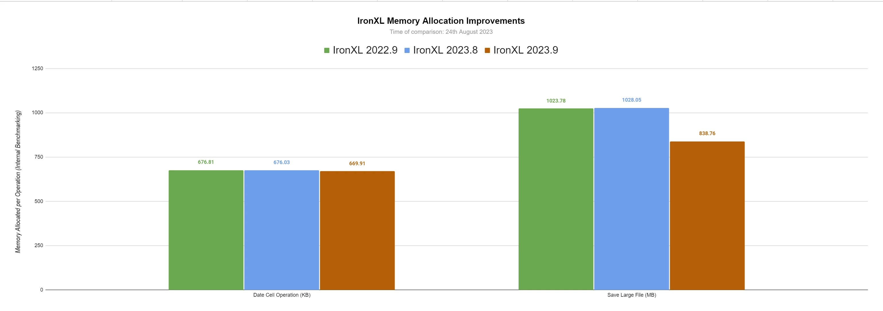 IronXL a connu d'énormes améliorations en termes de vitesse de fonctionnement et de mémoire. Dans cette section, nous comparerons IronXL à il y a un an, en septembre dernier (2022.9), ainsi qu'au mois dernier, en août (2023.8).