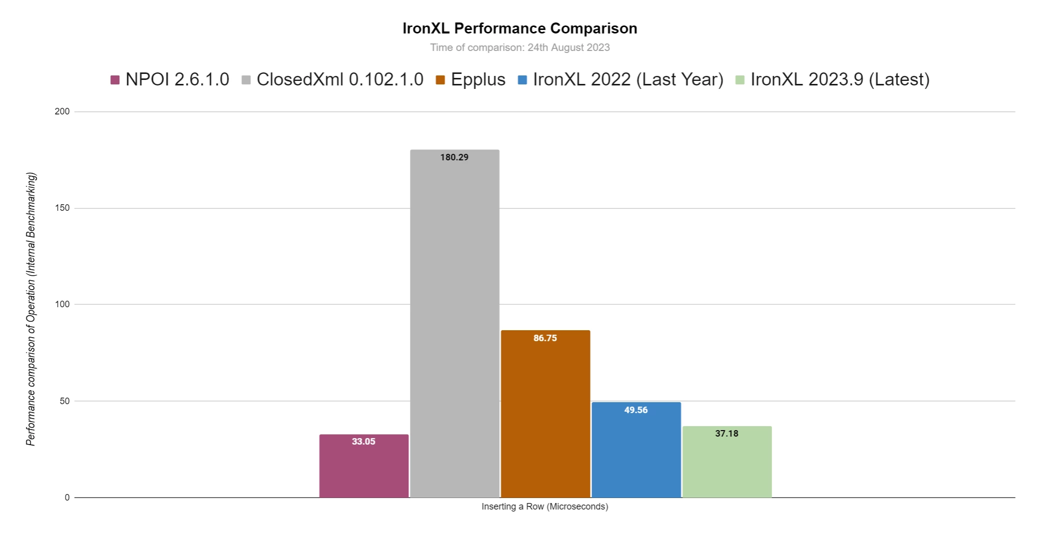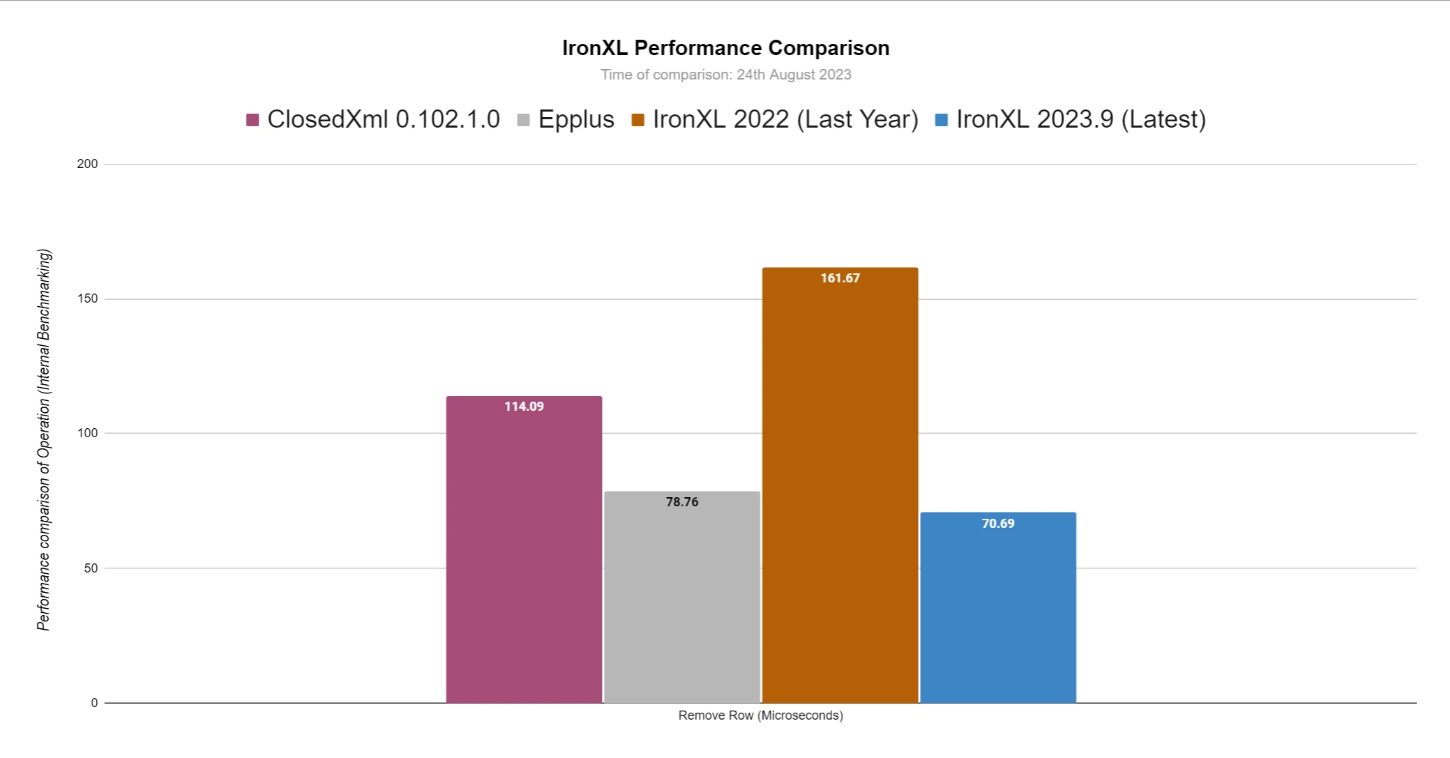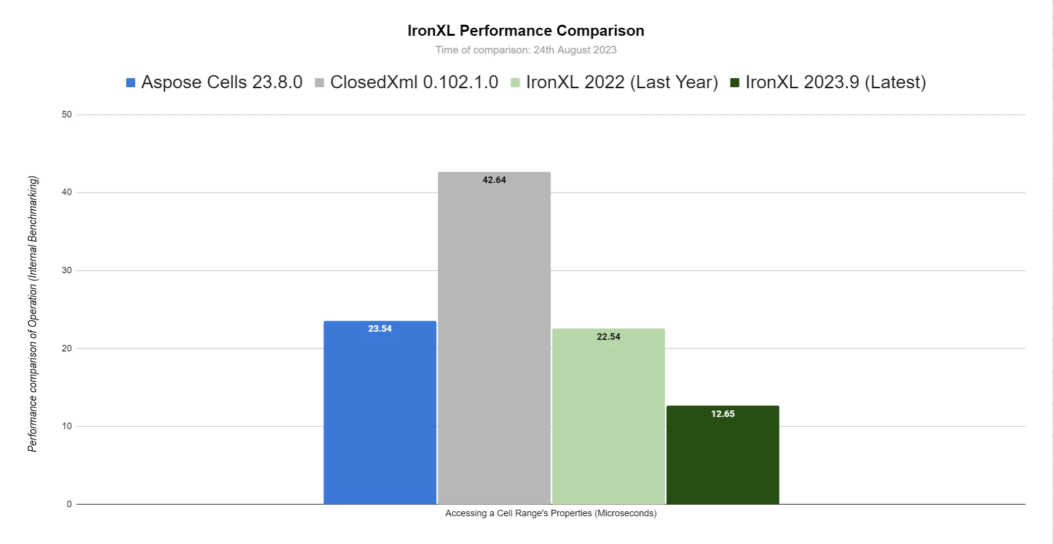 IronXL a connu d'énormes améliorations en termes de vitesse de fonctionnement et de mémoire. Dans cette section, nous comparerons IronXL à il y a un an, en septembre dernier (2022.9), ainsi qu'au mois dernier, en août (2023.8).