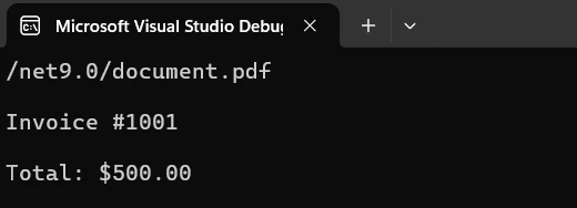 Ce code crée une instance IronTesseract qui sert de moteur OCR principal. La classe OcrInput gère le chargement des documents et accepte différents formats, notamment PNG, JPEG, TIFF, GIF et PDF. L'appel à Read() exécute le processus de reconnaissance et renvoie une classe OcrResult contenant le texte extrait ainsi que des métadonnées détaillées sur les niveaux de confiance, les positions des mots et la structure du document.