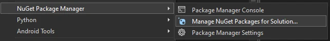 Le menu de Visual Studio affiche une liste déroulante Gestionnaire de packages NuGet avec trois options : Console du Gestionnaire de packages, Gérer les packages NuGet pour la solution et Paramètres du Gestionnaire de packages