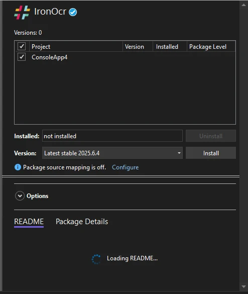 Le gestionnaire de packages NuGet d'IronOCR affiche les options d'installation pour la dernière version stable (2025.6.4) avec configuration de mappage des sources de packages disponible.