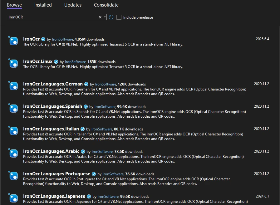 Le gestionnaire de packages NuGet présente la bibliothèque principale d'IronOCR (4,05 millions de téléchargements) et divers modules linguistiques, notamment l'allemand, l'espagnol, l'italien, l'arabe, le portugais et le japonais, illustrant ainsi les capacités de reconnaissance optique de caractères multilingues de la bibliothèque.