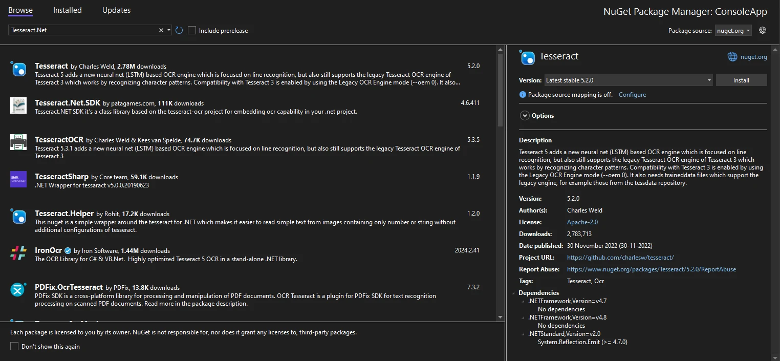 Après avoir ouvert votre projet C# dans Visual Studio, accédez à Outils -> Gestionnaire de packages NuGet -> Gérer les packages NuGet pour la solution. Vous devriez pouvoir trouver le package nommé " Tesseract " ou " Tesseract.NET " en recherchant " Tesseract " dans le gestionnaire de packages NuGet. Pour inclure le package dans votre projet, sélectionnez-le et cliquez sur Installer.