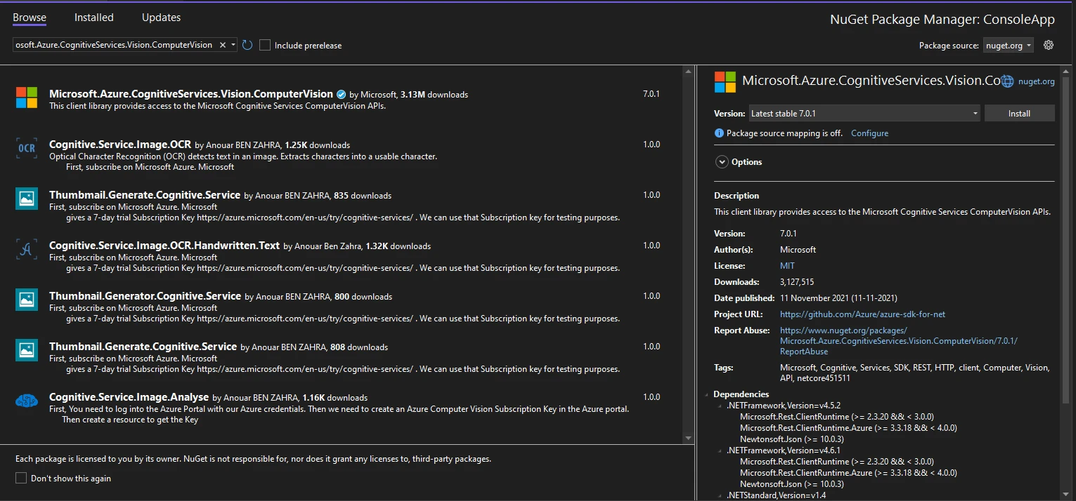 Installez le package en effectuant une recherche sur " Microsoft.Azure.CognitiveServices.Vision.ComputerVision ".