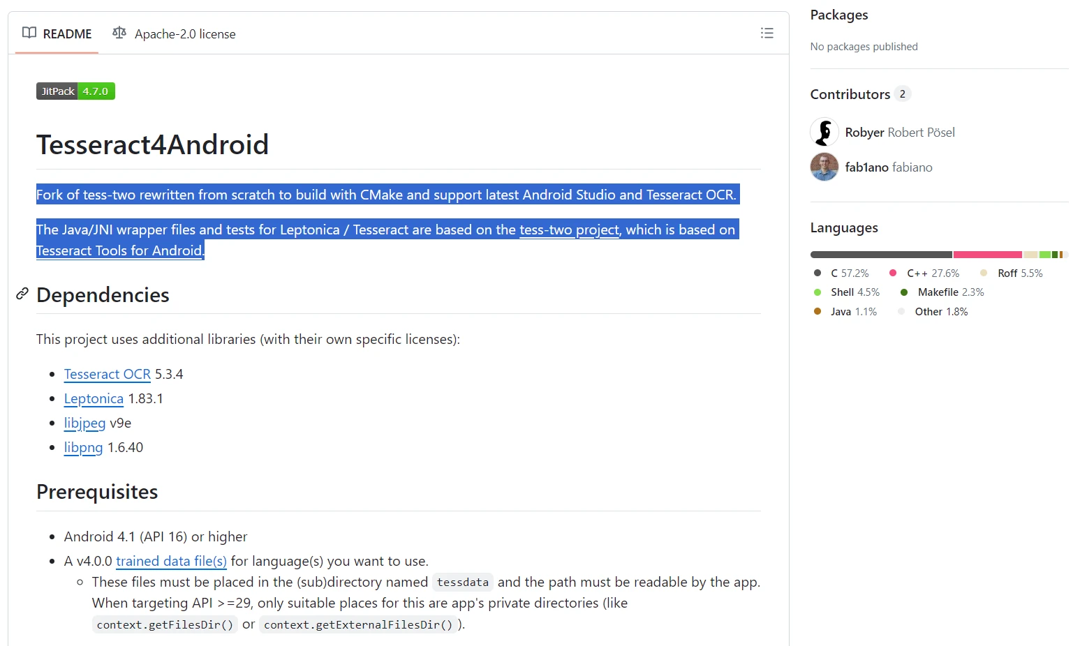 Explorons maintenant la bibliothèque innovante Tesseract4Android , qui offre des fonctionnalités OCR avancées spécialement conçues pour le développement Android.