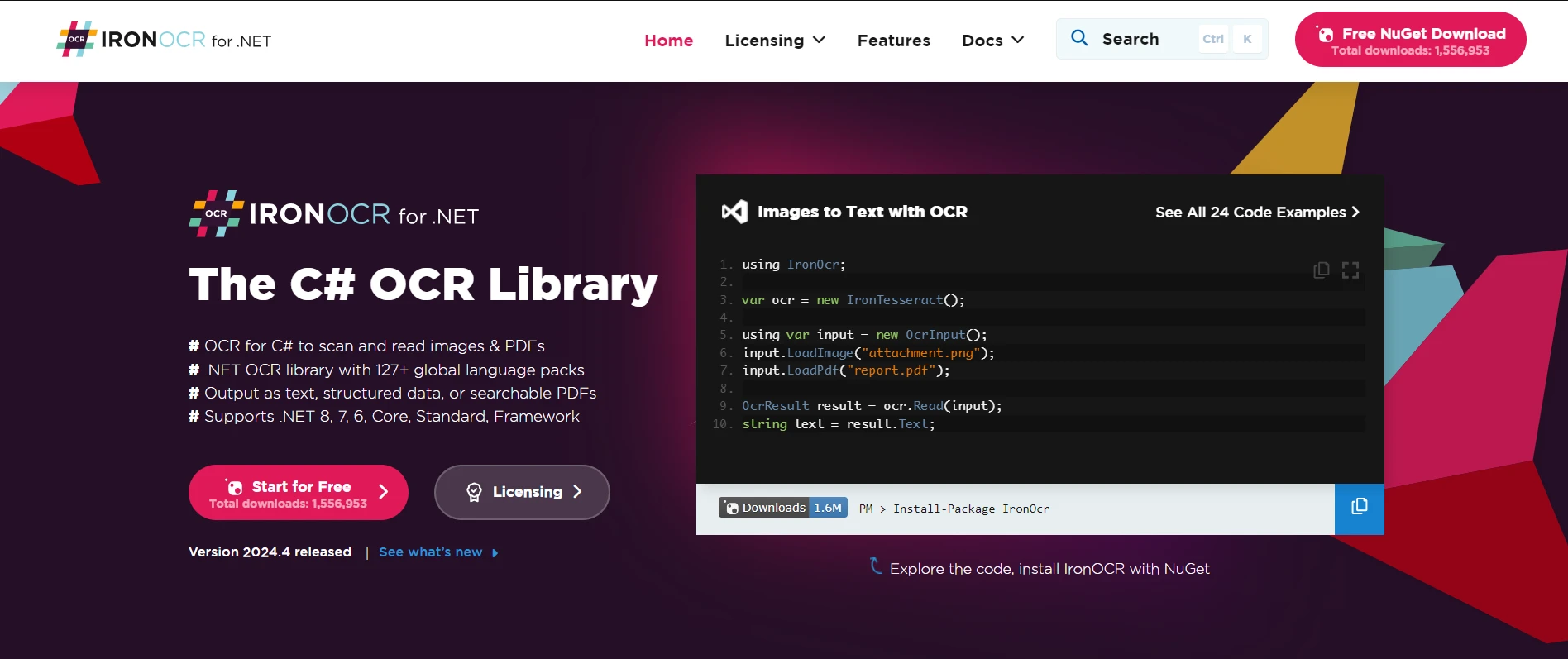 4. Facilité d'intégration : L'intégration d'IronOCR dans les applications .NET est simple, grâce à ses API intuitives et à sa documentation exhaustive. Grâce à une prise en charge complète des frameworks .NET tels que .NET Core et .NET Framework, les développeurs peuvent rapidement intégrer IronOCR à leurs projets et commencer à extraire du texte à partir d'images avec un minimum d'efforts.
