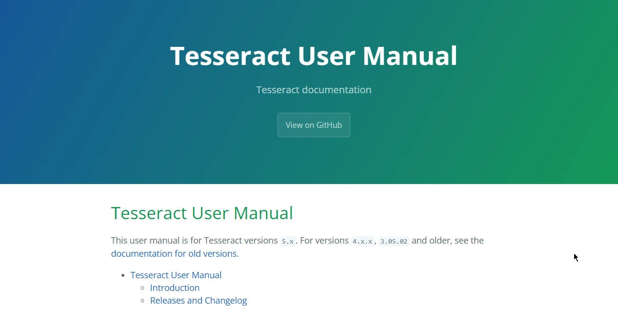 Meilleurs logiciels de reconnaissance optique de caractères (comparatif OCR) : Figure 3 - Page d'accueil du manuel d'utilisation de Tesseract