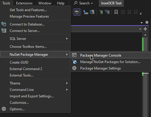 1. Installez le package IronOCR : dans la fenêtre de la console du gestionnaire de packages, saisissez la commande suivante et appuyez sur Entrée :