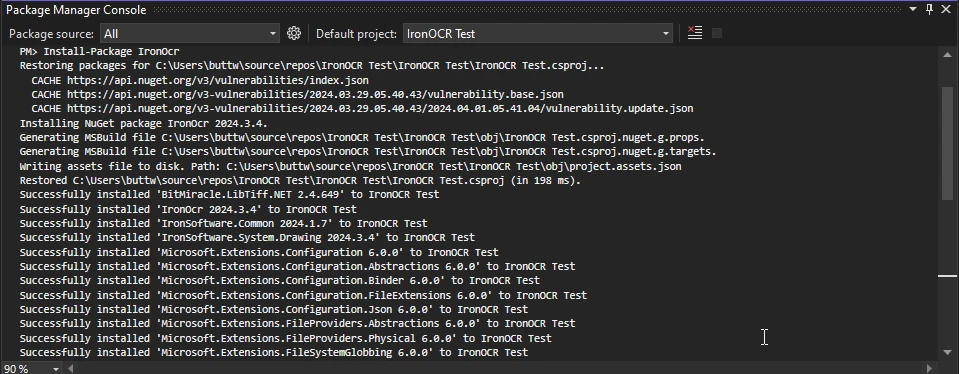 Meilleurs logiciels de reconnaissance optique de caractères (comparatif OCR) : Figure 6 - Installation d'IronOCR et de ses dépendances