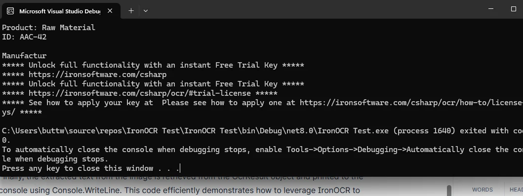 Ce code démontre efficacement comment exploiter IronOCR pour extraire du texte à partir d'images avec une complexité de code minimale.