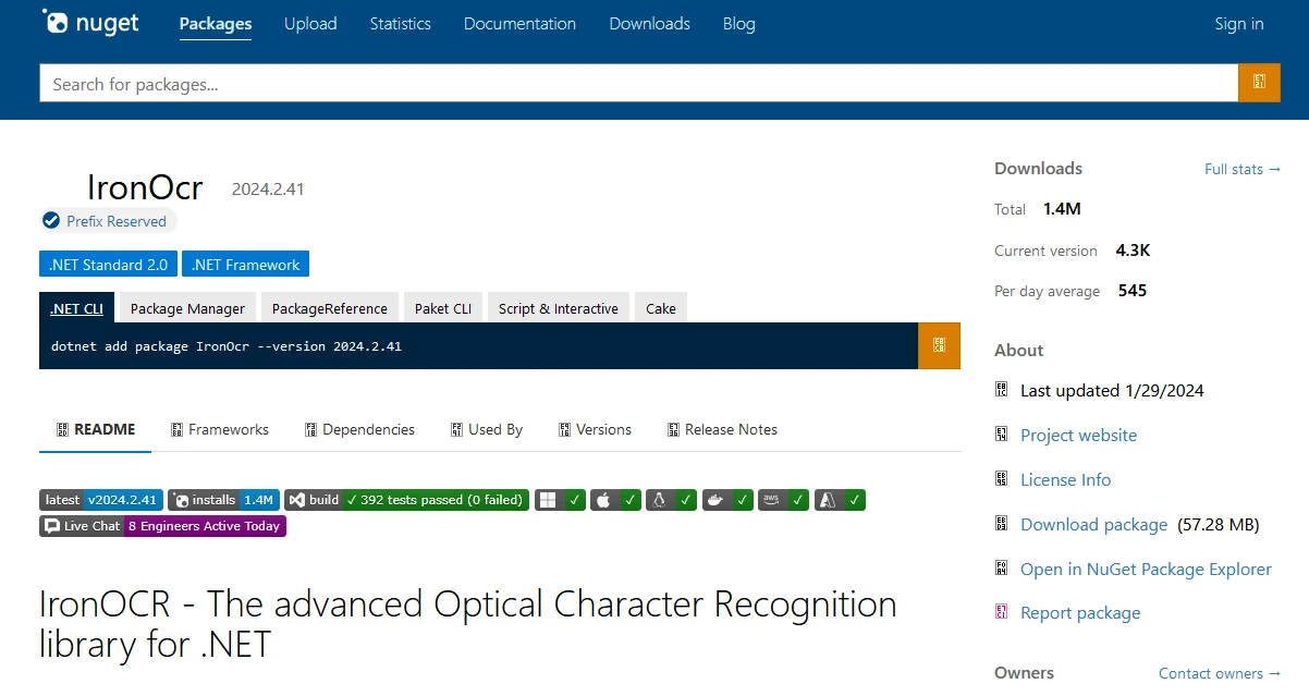 Comment créer une fonction de reconnaissance de caractères en C# : Figure 4 - Page de téléchargement du gestionnaire de packages NuGet IronOCR