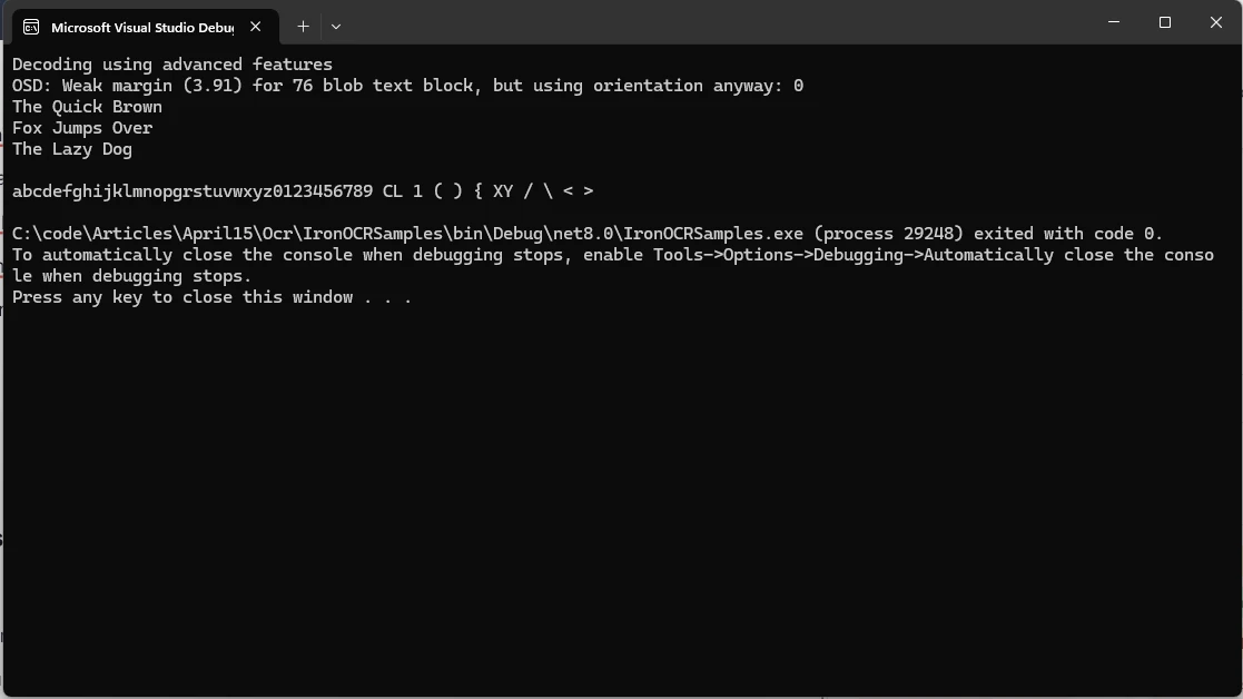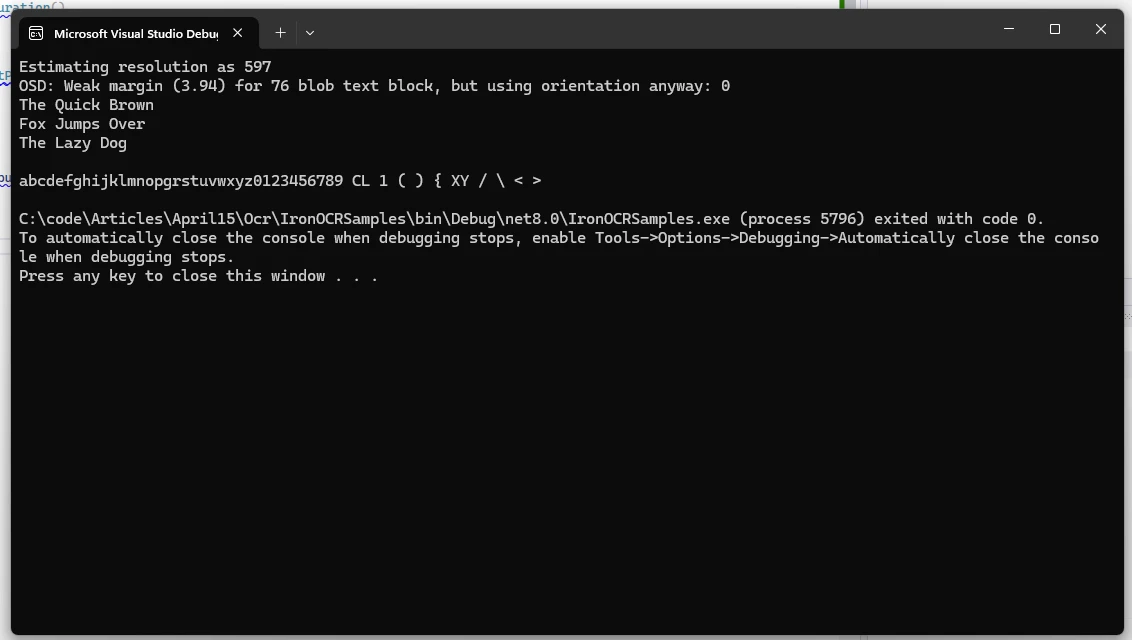 4. Sortie : Le texte extrait est imprimé dans la console à l'aide Console.WriteLine(ocrResult.Text) .