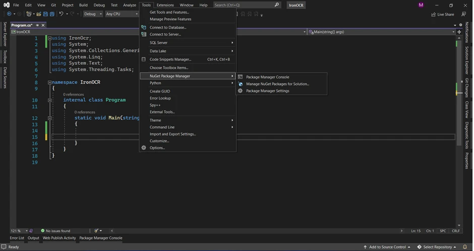 Comment créer une solution OCR pour les factures : Figure 3 - Comment accéder au gestionnaire de packages NuGet via Visual Studio