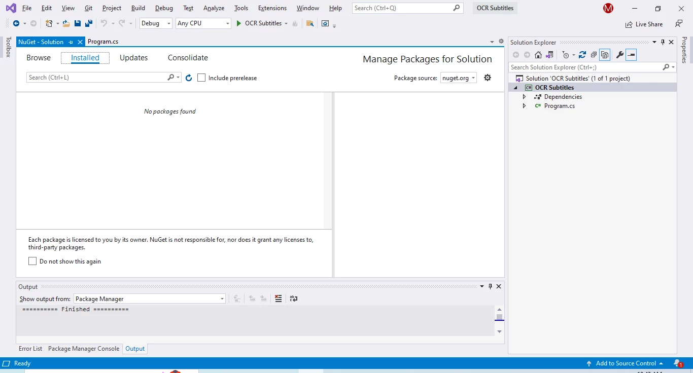 How to OCR Subtitles in C# (Tutorial), Figure 3 : Visual Studio NuGet Package Manager UI Visual Studio NuGet Package Manager UI