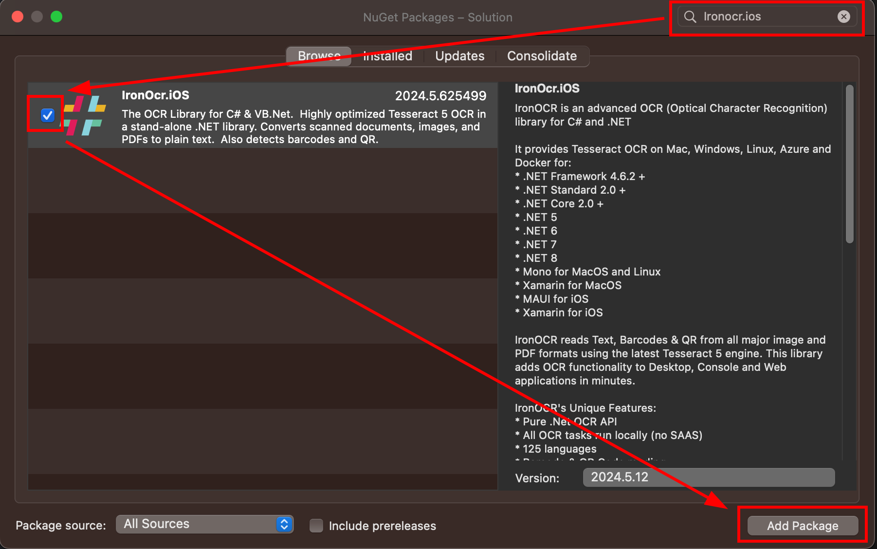 3. Sélectionnez le package " IronOcr.iOS " et cliquez sur " Ajouter un package ".