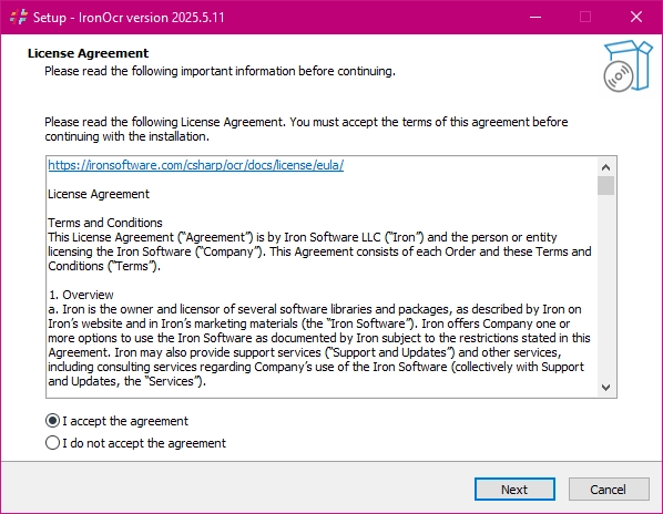 1. Lancer l'installateur: Double-cliquez sur le fichier exécutable. Lisez attentivement le contrat de licence utilisateur final. Pour continuer, cochez la case indiquant votre accord, puis cliquez sur Suivant. Accord-de-licence- IronOCR