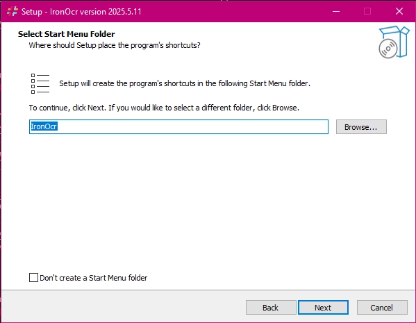 3. Sélectionner le dossier du menu Démarrer: Ici, vous pouvez choisir de créer un raccourci de programme. Vous pouvez soit parcourir et sélectionner un emplacement de raccourci, soit choisir de ne pas créer de dossier dans le menu Démarrer. Menu de démarrage d'IronOCR
