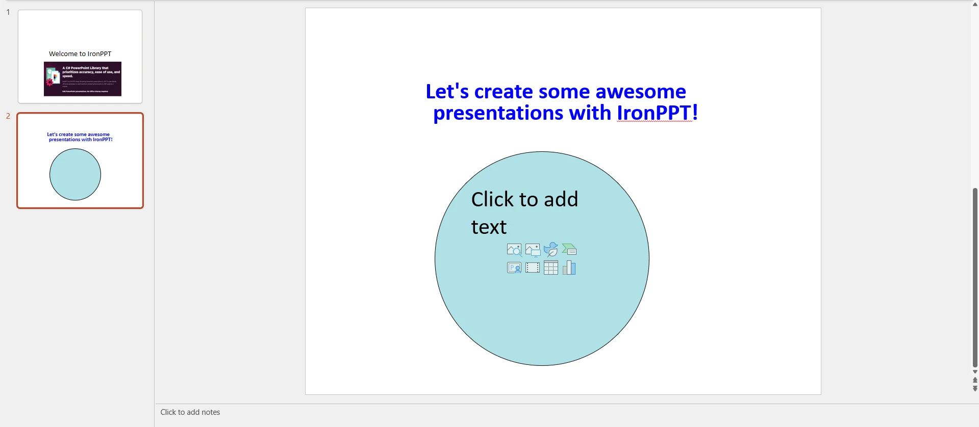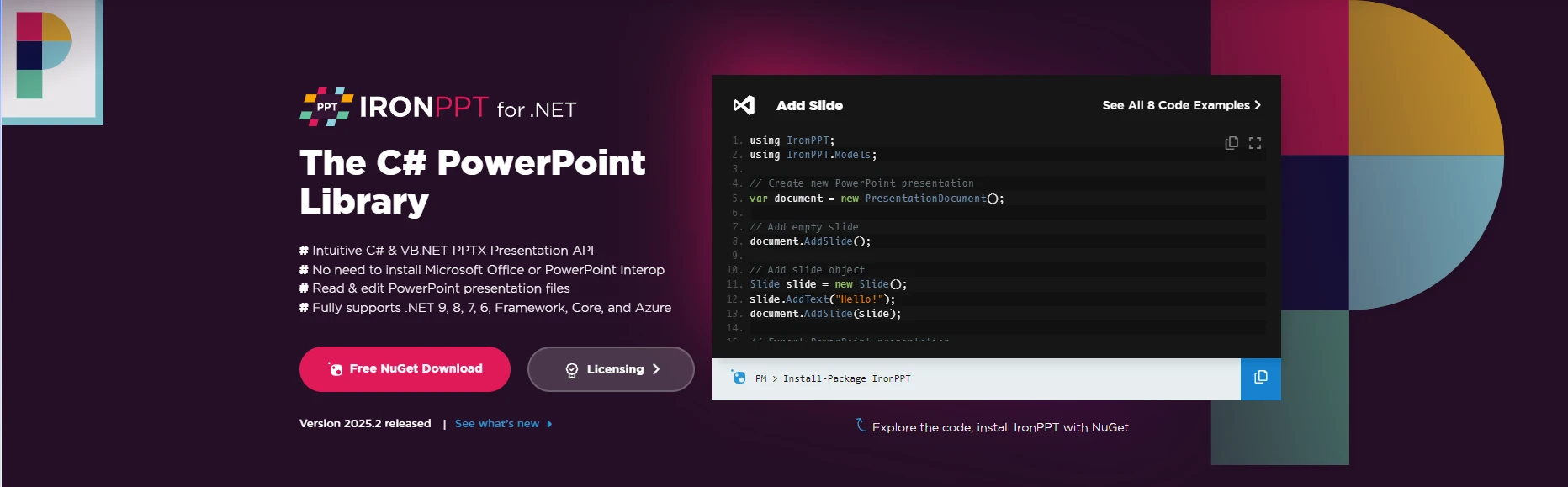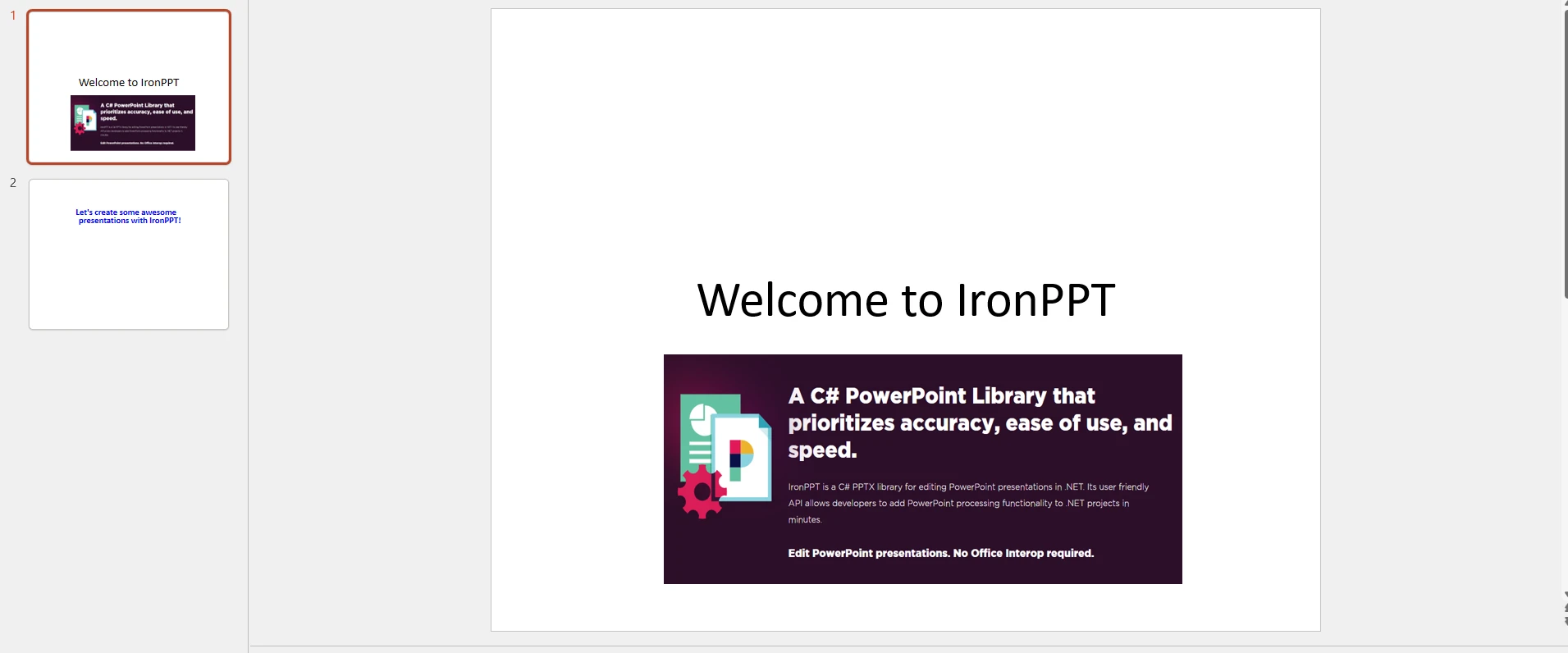 ! IronPPT - Bibliothèque de présentations C# La bibliothèque IronPPT pour .NET permet aux développeurs de créer et de gérer par programmation des fichiers PowerPoint en C#.