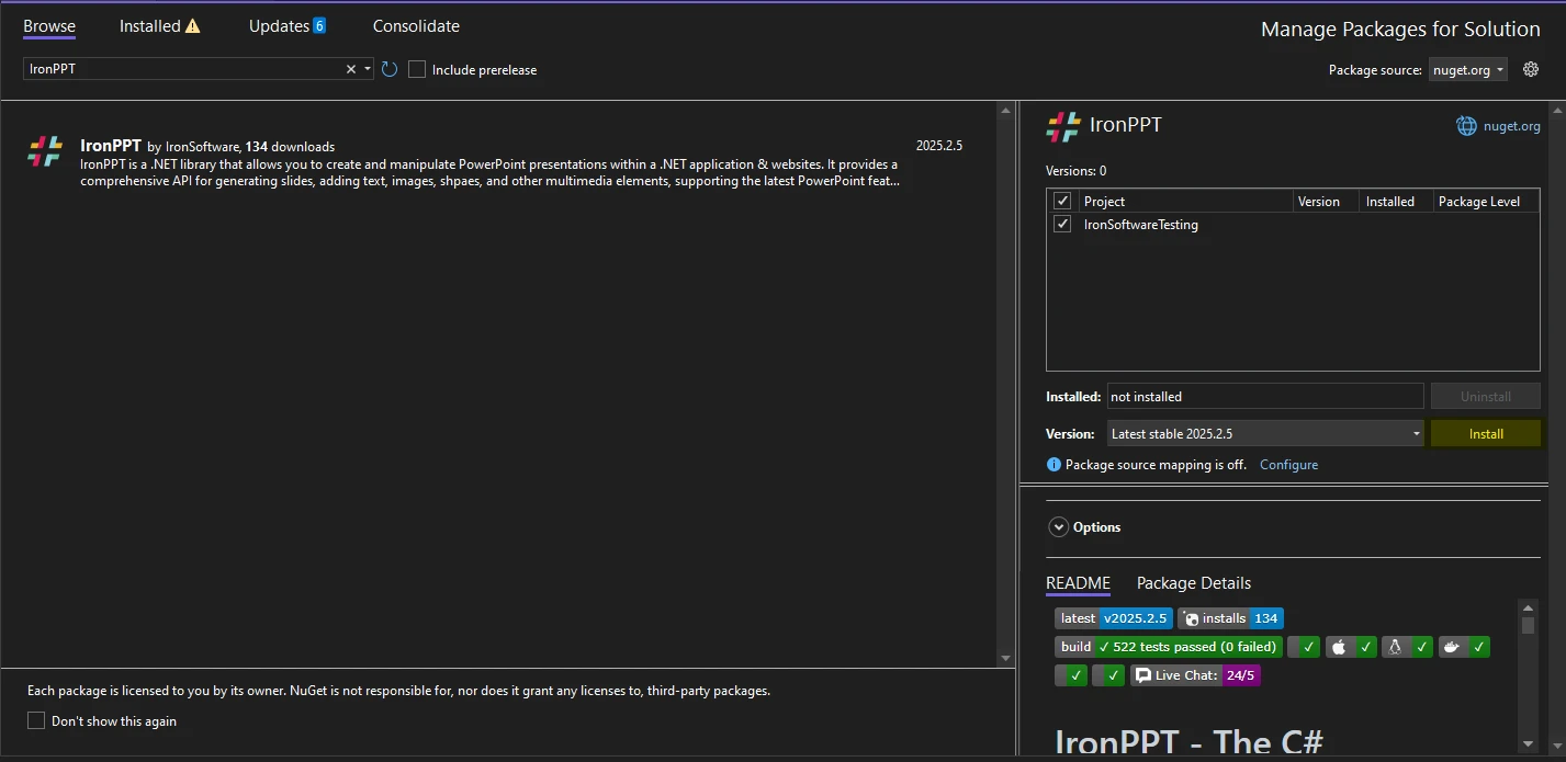 Vous pouvez également rechercher " IronPPT " dans l'interface graphique du gestionnaire de packages NuGet et l'installer à partir de là.