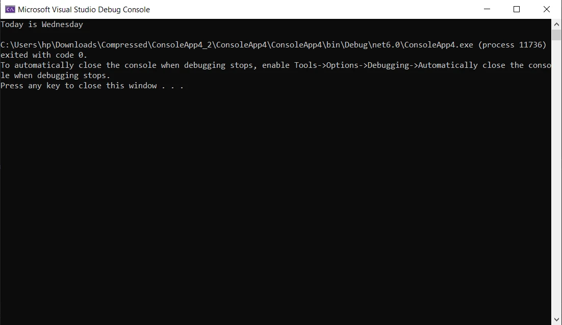Console.WriteLine($"Today is {today}"); // Print the current day