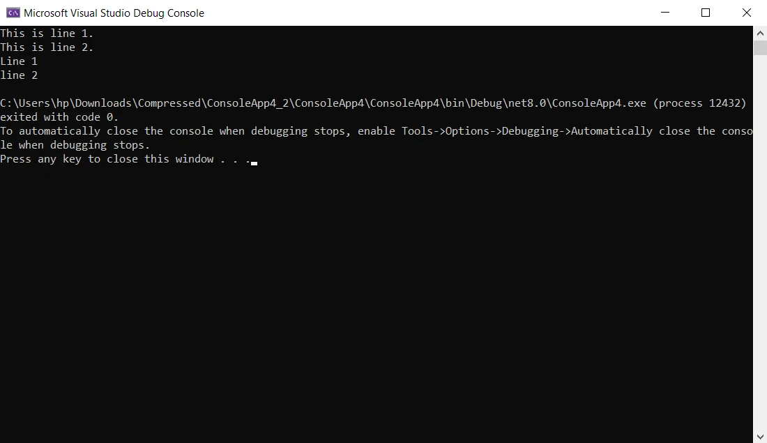 Dans l'exemple ci-dessus, après l'exécution du programme, chaque Console.WriteLine produit une nouvelle ligne dans la fenêtre de console C#, ce qui donne les deux lignes spécifiées.
