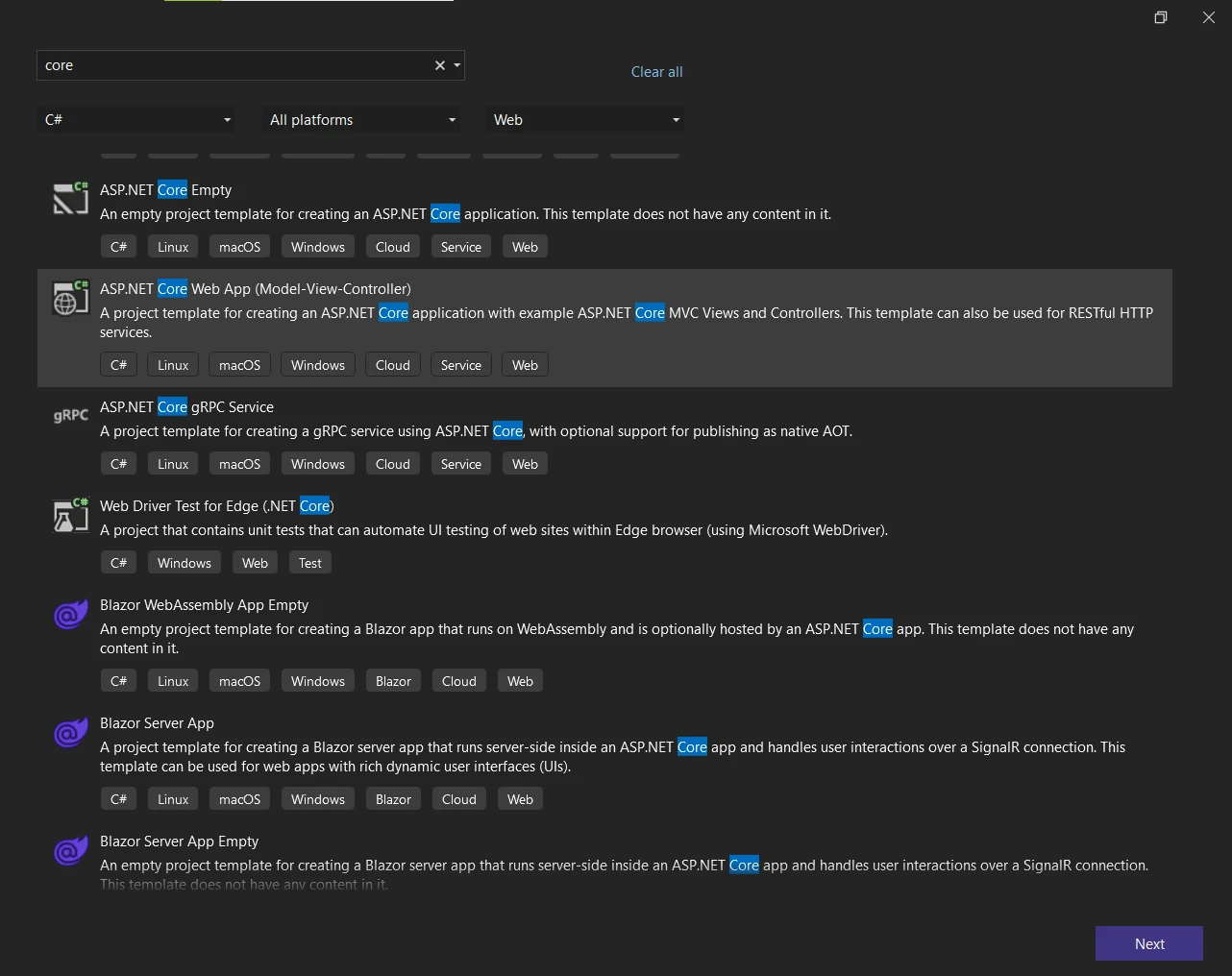 Création de votre projet .NET Core : Ouvrez Visual Studio et sélectionnez " Créer un nouveau projet ". Dans la fenêtre de sélection du modèle de projet, filtrez par " Web " sous " Toutes les plateformes " et sélectionnez " Application Web ASP.NET Core ".