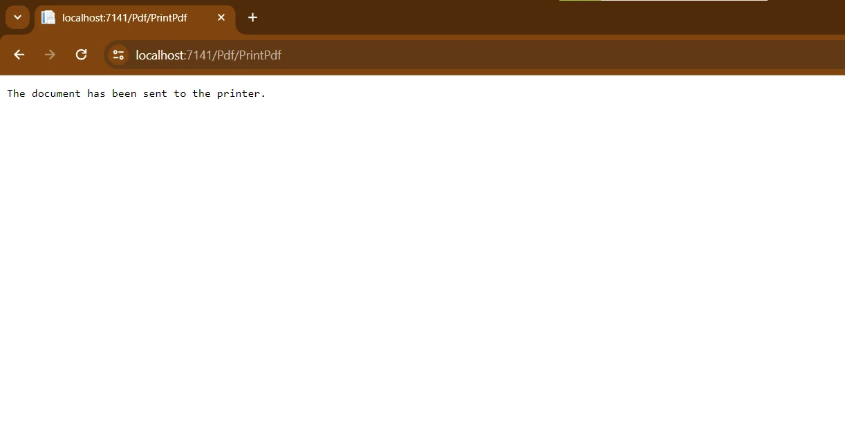 N'oubliez pas de remplacer " Nom de votre imprimante " par le nom réel de votre imprimante. L'imprimante doit être accessible au serveur sur lequel l'application ASP.NET Core est exécutée. Lorsque vous exécutez le programme et accédez à l'URL " **https://localhost:<Your-Port> /Pdf/PrintPdf** , vous verrez le message de sortie indiquant que le PDF a été envoyé à l'imprimante.
