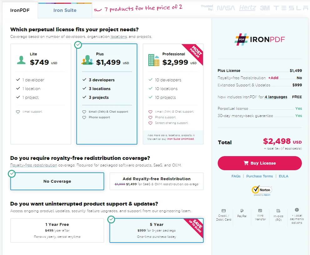 Pour ceux qui souhaitent utiliser IronPDF, il est important de noter que la bibliothèque propose un essai gratuit , vous permettant d'évaluer ses fonctionnalités avant de vous engager. Si vous estimez qu'il répond à vos besoins, les licences IronPDF commencent à partir de $799 , offrant une solution évolutive pour les projets de petite et de grande envergure. Vous trouverez ci-dessous les tarifs des licences IronXL, et vous pouvez cliquer ici pour en savoir plus.