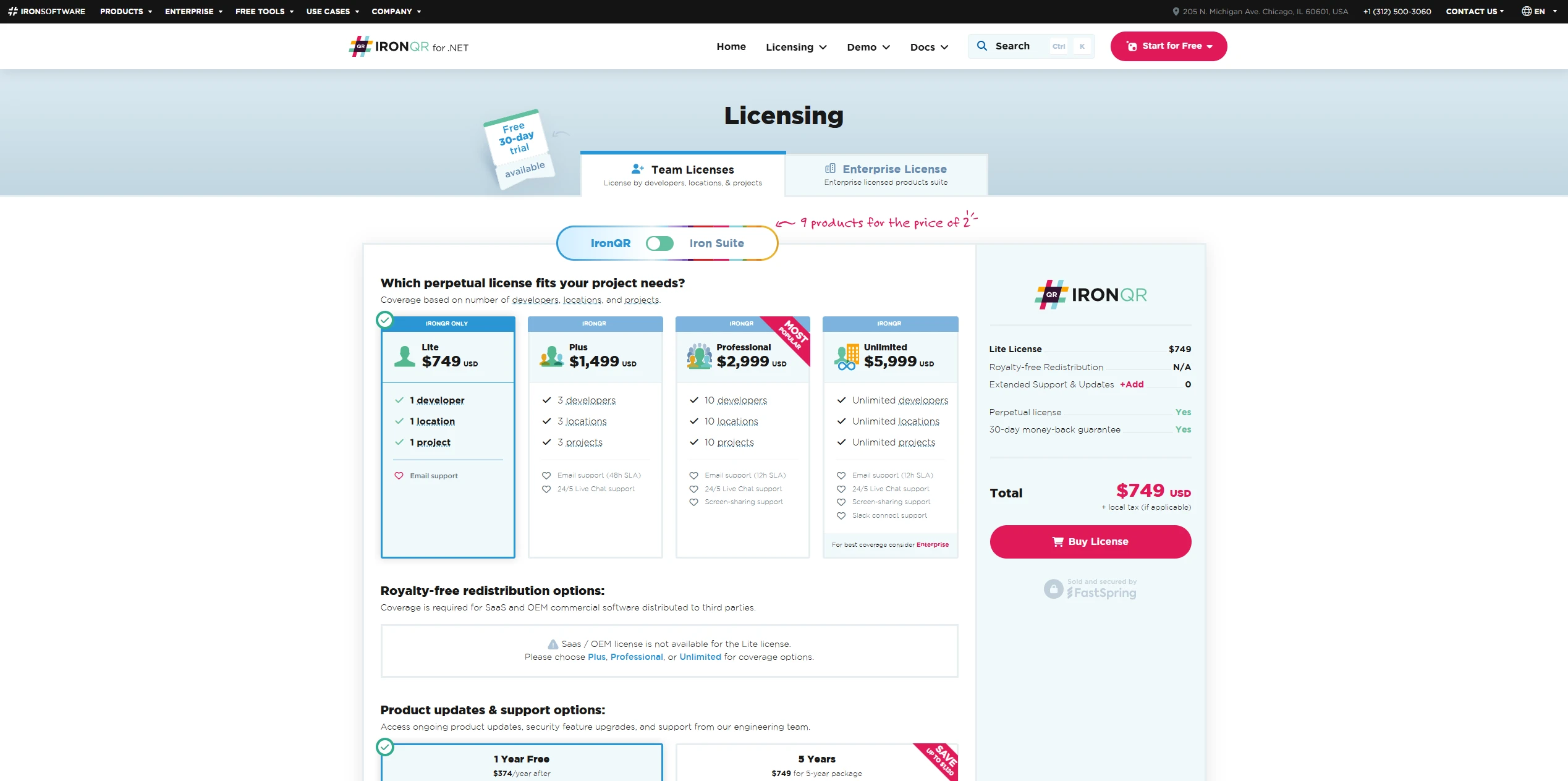 Pour les développeurs, aller plus loin dans l'intégration des codes QR est facilité par IronQR. Cette bibliothèque robuste offre précision, rapidité et une flexibilité inégalée pour le décodage ou la création de codes QR. IronQR prend en charge un large éventail de formats et fournit des outils pour personnaliser les codes QR afin de répondre aux besoins uniques des projets. Vous pouvez l'essayer avec une essai gratuit et découvrir tout son potentiel. Les licences commencent à $liteLicense, offrant une solution abordable pour les développeurs à la recherche d'un outil de code QR fiable et puissant.