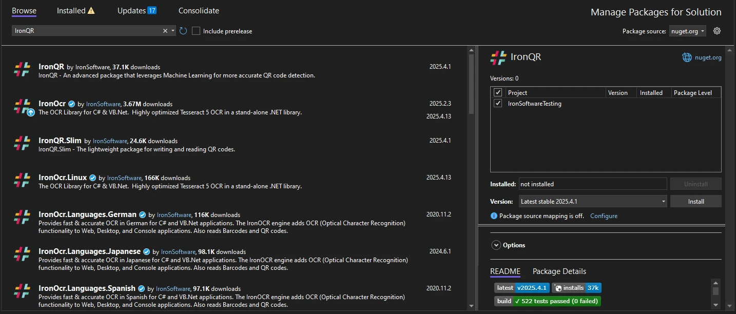 Vous pouvez également utiliser l'interface graphique NuGet dans Visual Studio en recherchant IronQR, puis en cliquant sur "Installer" :