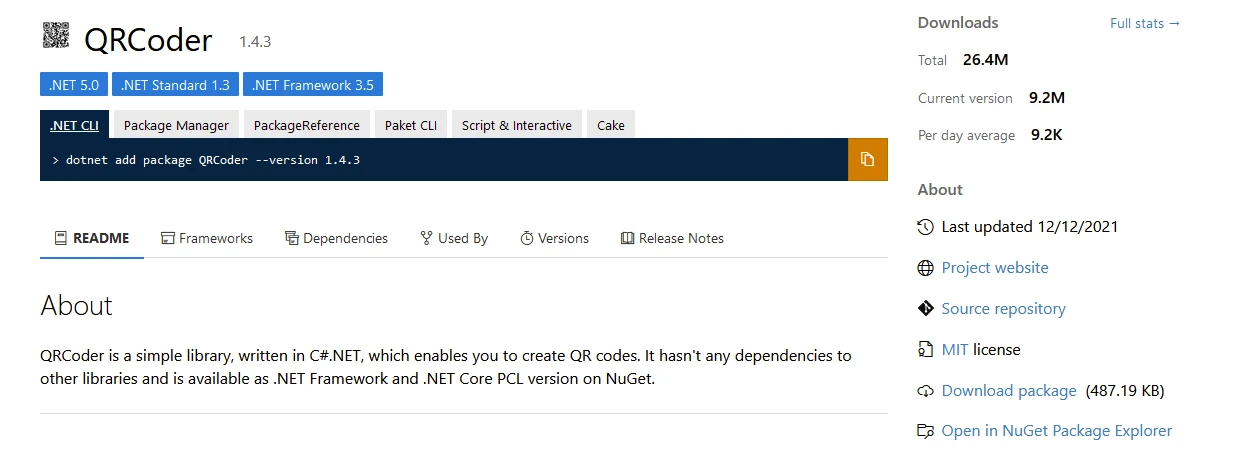 Le paquetage NuGet QRCoder est disponible sur le site Web de NuGet à l'adresse suivante