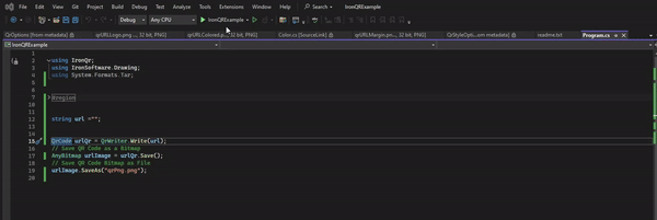IronQR est flexible et adaptable à divers cas d'utilisation nécessitant différents formats de fichiers. Vous pouvez enregistrer les codes QR dans plusieurs formats tels que JPG, PNG, GIF et TIFF en utilisant la méthode SaveAs .