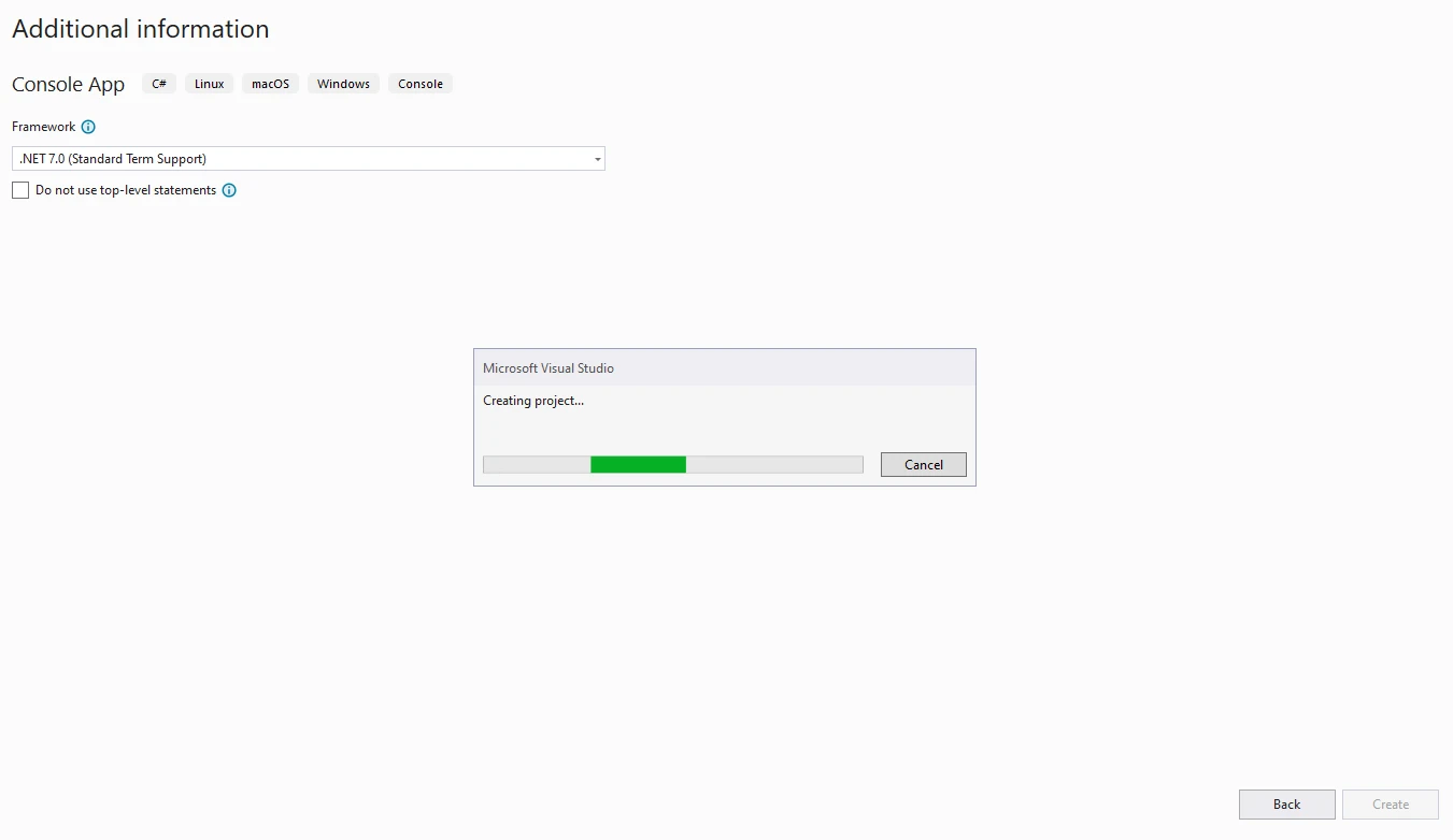 Sélectionnez la version .NET et cliquez sur "Créer".