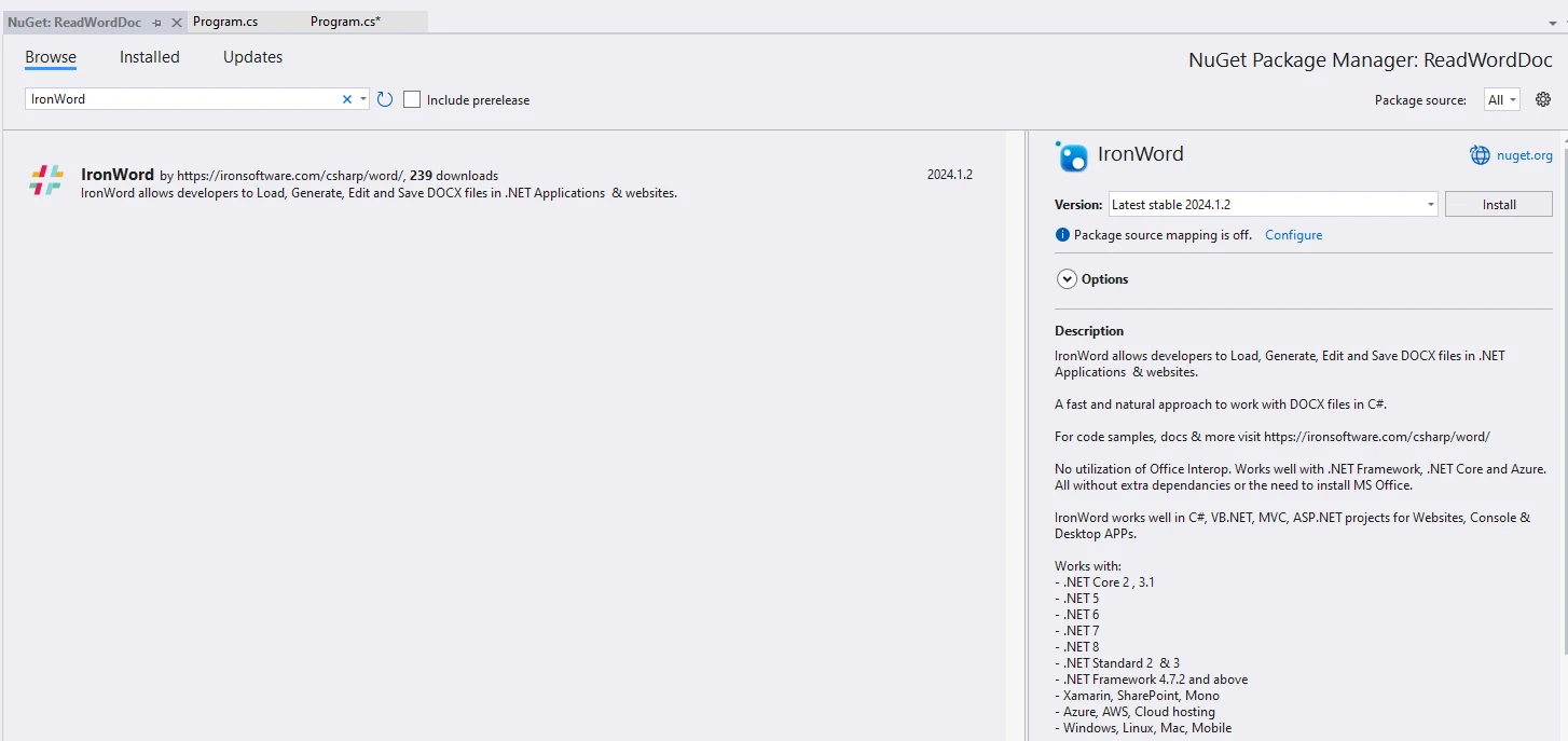 Comment lire un document Word formaté en C# : Figure 4 - Installation d'IronWord via le gestionnaire de packages NuGet