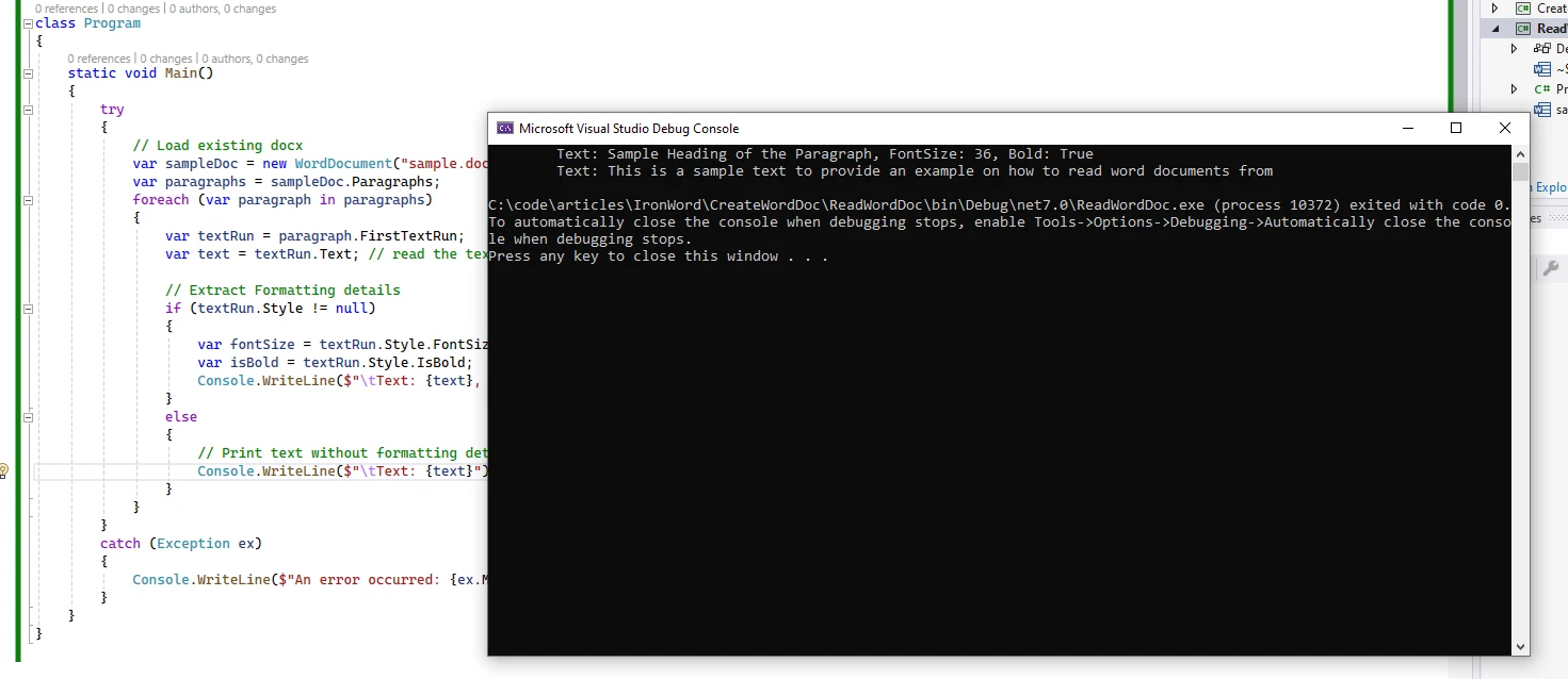 Le code ci-dessus lit le document Word en utilisant la méthode constructeur WordDocument de la classe de la bibliothèque IronWord.