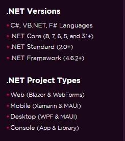 IronWord est compatible avec une gamme d'environnements de développement, y compris Blazor, WebForms, Xamarin, MAUI, WPF et les applications console, prenant en charge C#, VB.NET, et F# sur .NET Core, .NET Standard et .NET Framework.