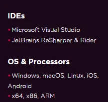 IronWord est également compatible avec les principaux environnements de développement intégrés (IDE) tels que Microsoft Visual Studio, ReSharper et Rider, offrant ainsi aux développeurs une grande flexibilité dans le choix de leurs outils. Enfin, il prend en charge divers systèmes d'exploitation et architectures de processeurs (x64, x86, ARM), garantissant des performances efficaces sur diverses configurations matérielles.
