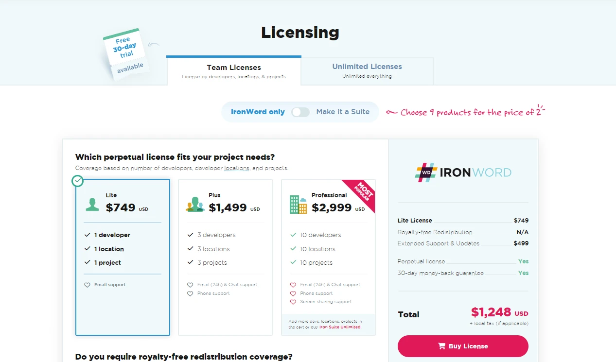IronWord propose différentes options de licence pour répondre aux besoins des différents développeurs et organisations. Ils proposent une licence perpétuelle, ce qui signifie que vous payez une seule fois et qu'il n'y a pas de frais récurrents. Chaque licence inclut un an d'assistance produit et de mises à jour. Les différents niveaux de licence sont conçus en fonction du nombre de développeurs, de sites et de projets que vous avez. Vous pouvez également bénéficier d'un essai gratuit pour vous familiariser avec le produit avant d'acheter une licence.