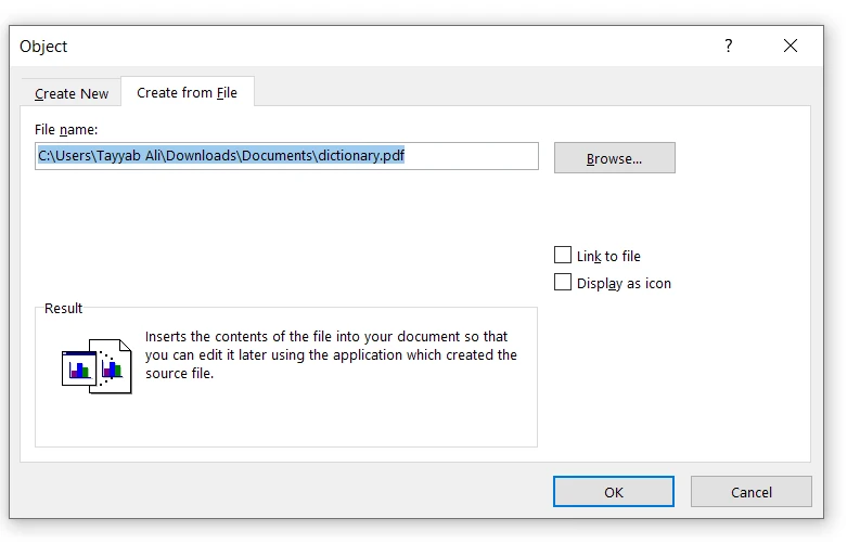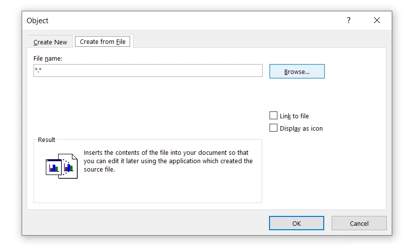 5. Passez à l'onglet " Créer à partir d'un fichier " dans la boîte de dialogue Objet.