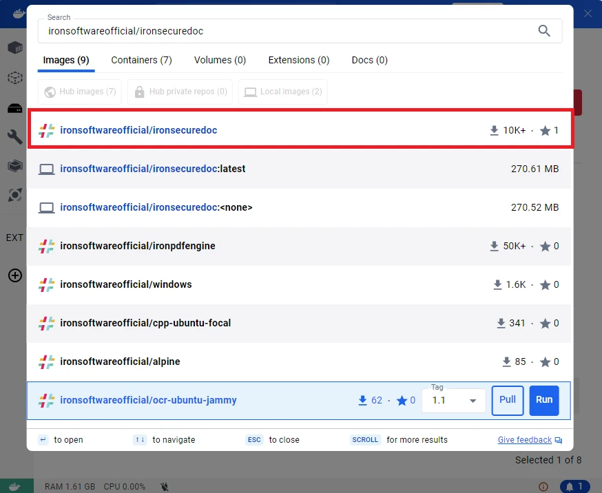 Dans l'application Docker, recherchez ironsoftwareofficial/ironsecuredoc dans le champ de recherche. Sélectionnez l'image souhaitée parmi les résultats, puis cliquez sur " Extraire " pour télécharger l'image dans votre application Docker.