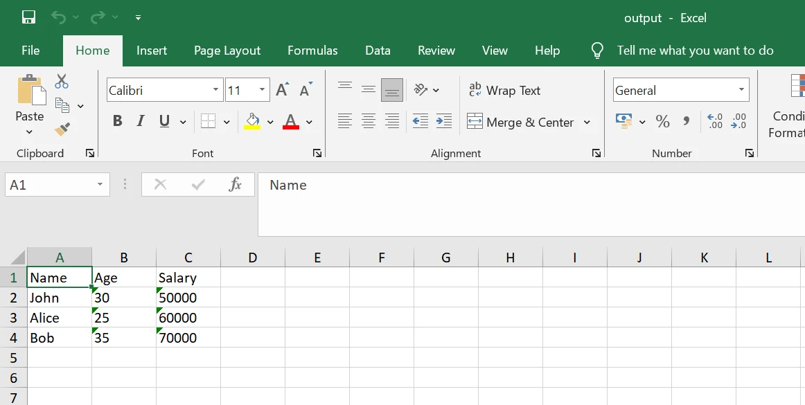 L'extrait de code ci-dessus crée un exemple de jeu de données sous forme de liste de listes représentant les lignes et les colonnes de données. Ensuite, nous utilisons des boucles imbriquées pour écrire chaque cadre de données dans une nouvelle feuille de calcul Excel créée à l'aide de la méthode CreateWorkSheet d'IronXL. Nous pouvons créer plusieurs feuilles de la même manière. Le fichier cible de sortie peut être enregistré sous le nom " output.xlsx ", ce qui crée un nouveau fichier Excel à l'emplacement spécifié.