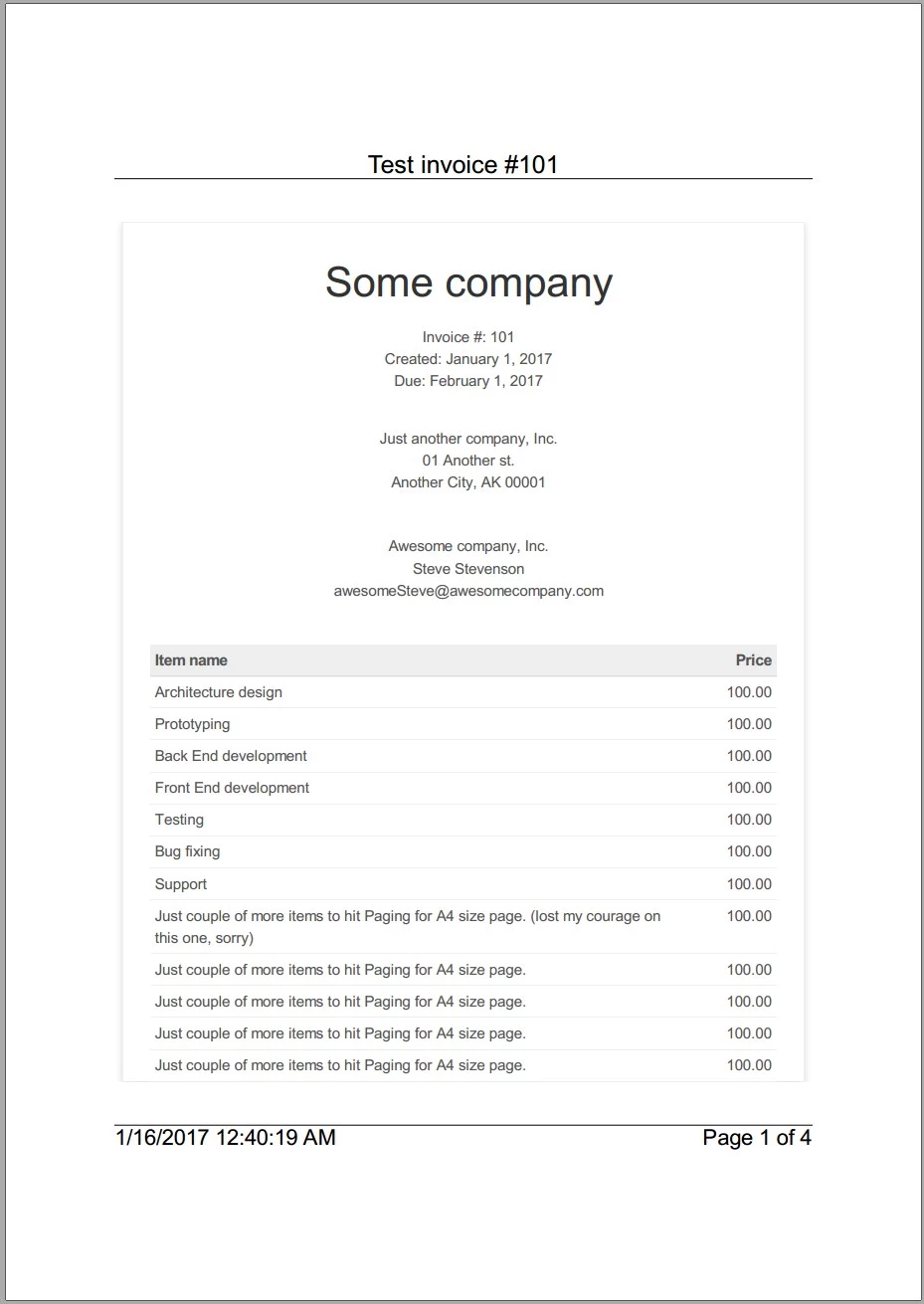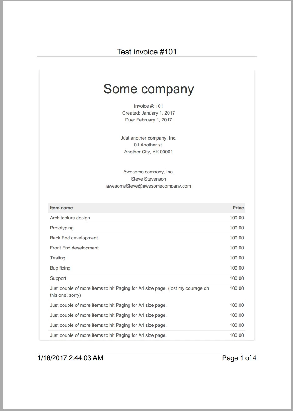 Cette section vous aidera à personnaliser le PDF résultant de l'exemple 1. Par exemple, elle ajoutera des marges personnalisées, un en-tête avec un titre de document, un pied de page avec une date de création et des numéros de page, ainsi qu'une CSS personnalisée pour le type de média " impression " qu'une facture standard possède. Pour ce faire, une instance de ChromePdfRenderOptions est initialisée et transmise au constructeur ChromePdfRenderer .