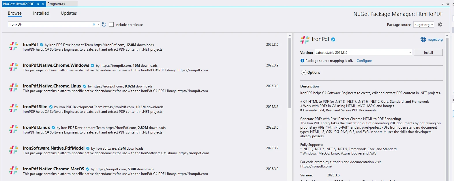 - Ajoutez la bibliothèque IronPDF depuis le gestionnaire de packages NuGet.
