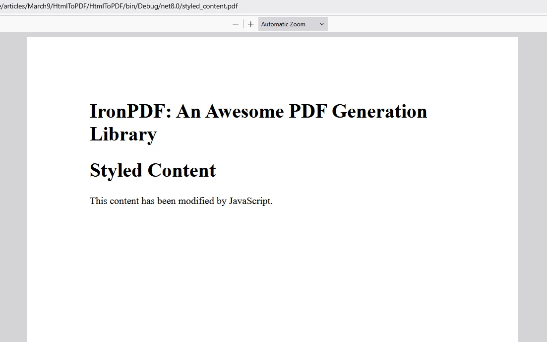 styles.cssetscript.jsdoivent être accessibles dans l'environnement où le code s'exécute. Si les fichiers sont locaux, assurez-vous qu'ils se trouvent dans le bon répertoire ou indiquez le chemin d'accès complet aux fichiers. - JavaScript dans les PDF : IronPDF peut afficher du contenu qui utilise JavaScript pour le comportement de la page. Il est toutefois important de noter que JavaScript peut ne pas s'exécuter comme prévu dans un fichier PDF statique, car les fichiers PDF ne sont pas intrinsèquement dynamiques comme les pages web. IronPDF utilise principalement JavaScript pour afficher le contenu avant la génération du PDF ; par conséquent, la manipulation dynamique du contenu via JavaScript peut ne pas fonctionner après la création du PDF.