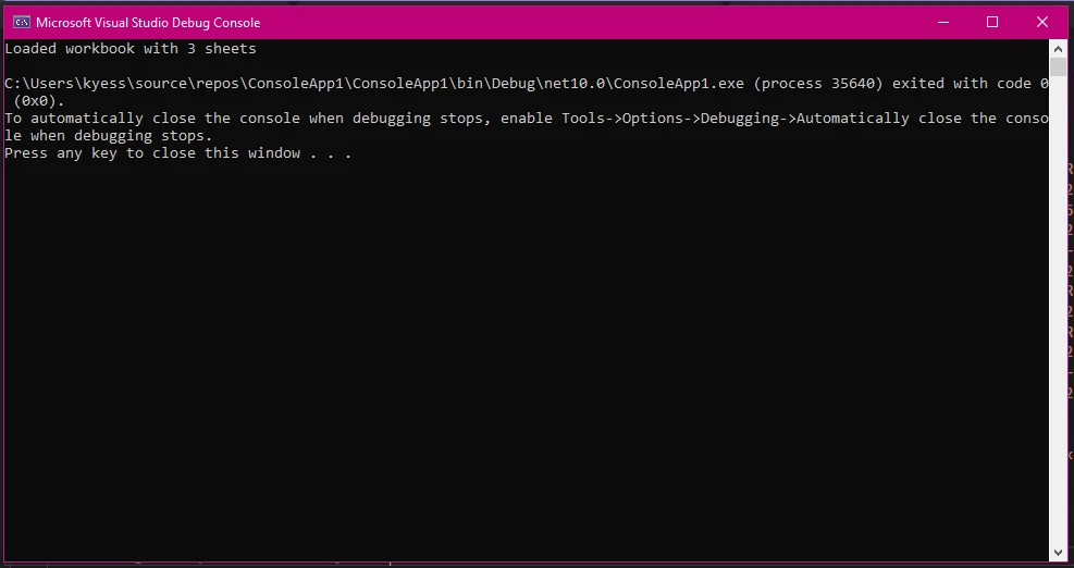 C#でIronXLを使用してExcelファイルを読み込む最良の方法: 画像1 - 読み込まれたワークブックの確認のためのコンソール出力</a